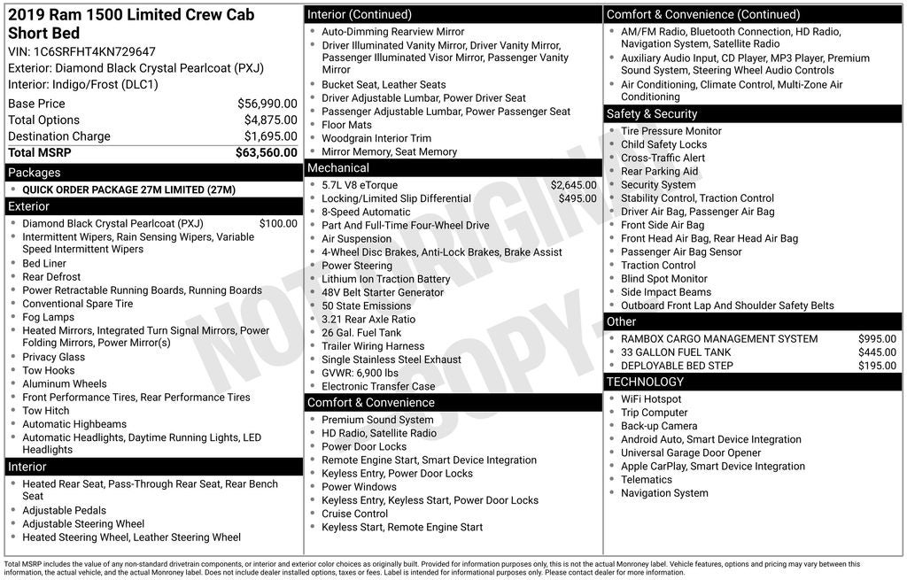 Diamond Black Crystal Pearlcoat 2019 Ram 1500 Limited 4D Crew Cab 4WD 8-Speed Automatic HEMI 5.7L V8 Multi Displacement VVT